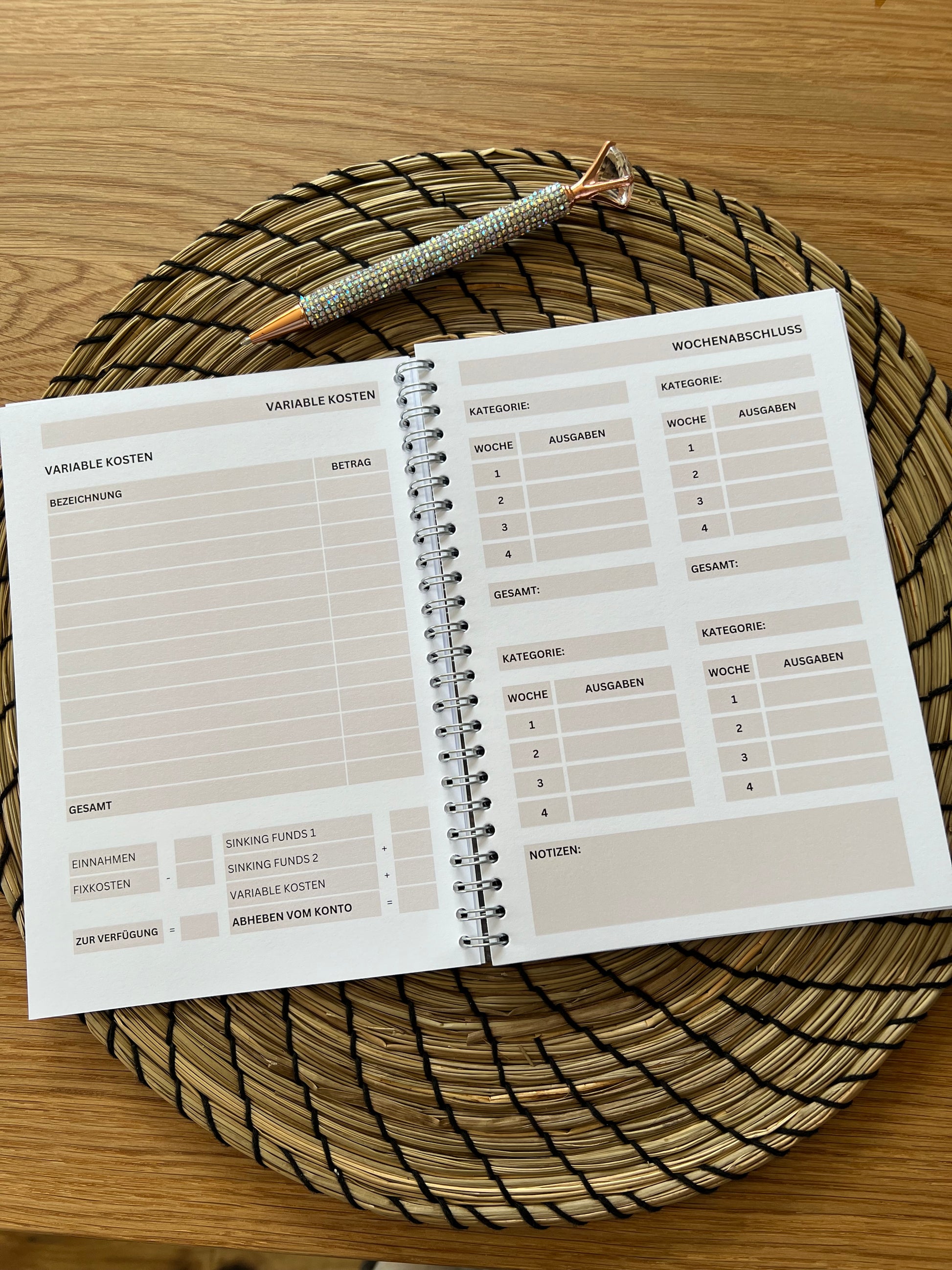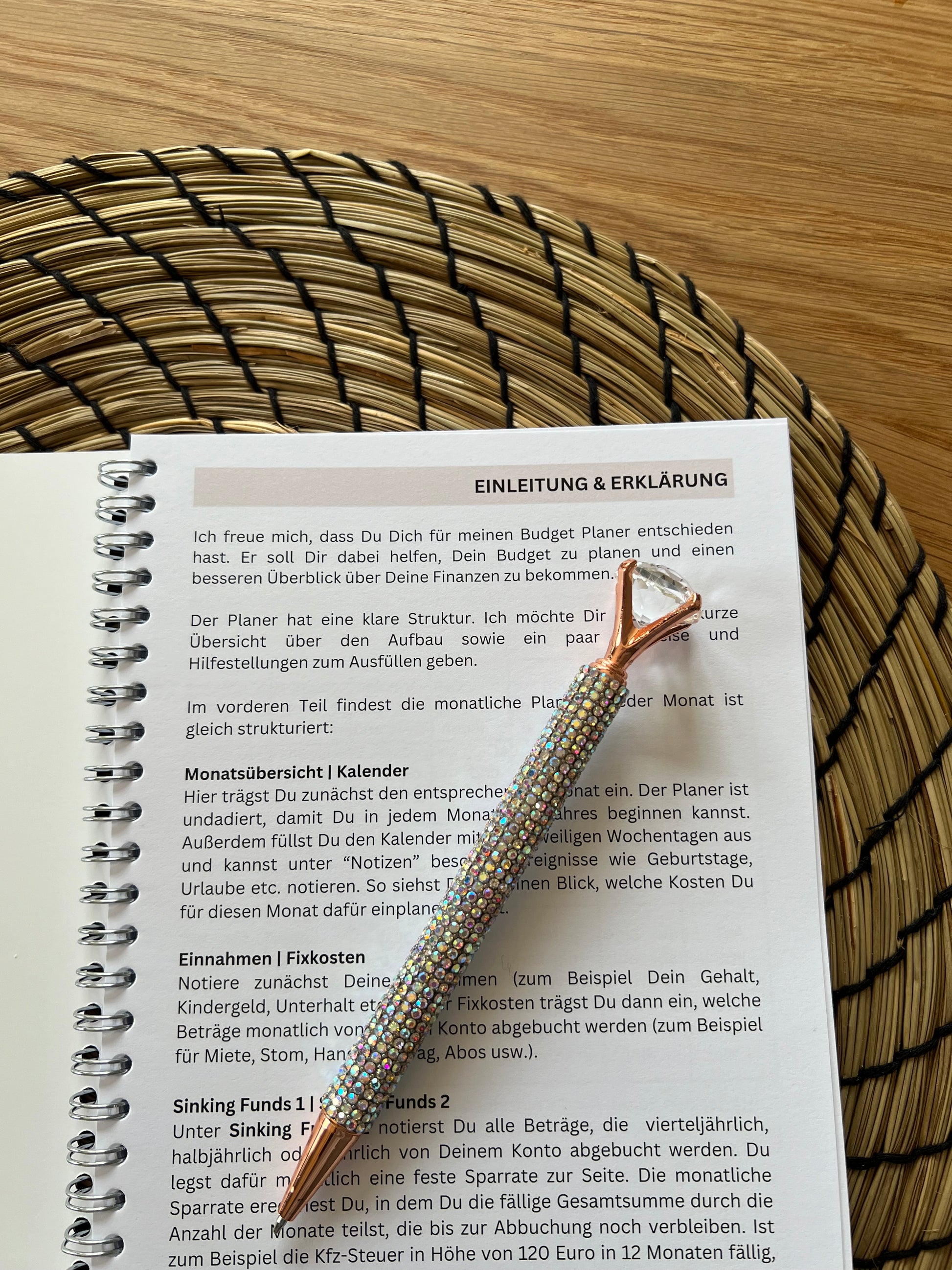 Der Budgetplaner besteht aus 108 Seiten im A5 Format. Er ist gedruckt auf hochwertigem Papier. Vorne und hinten wird er durch eine stabile Folie geschützt.