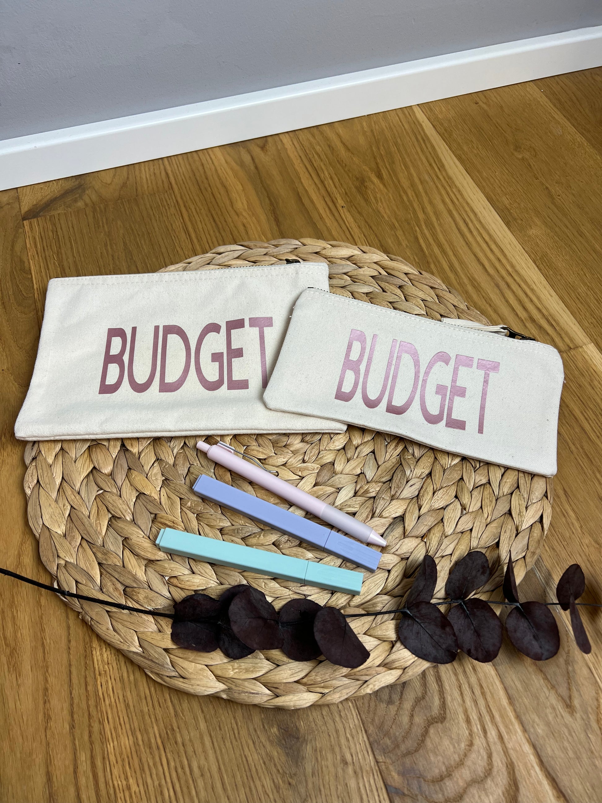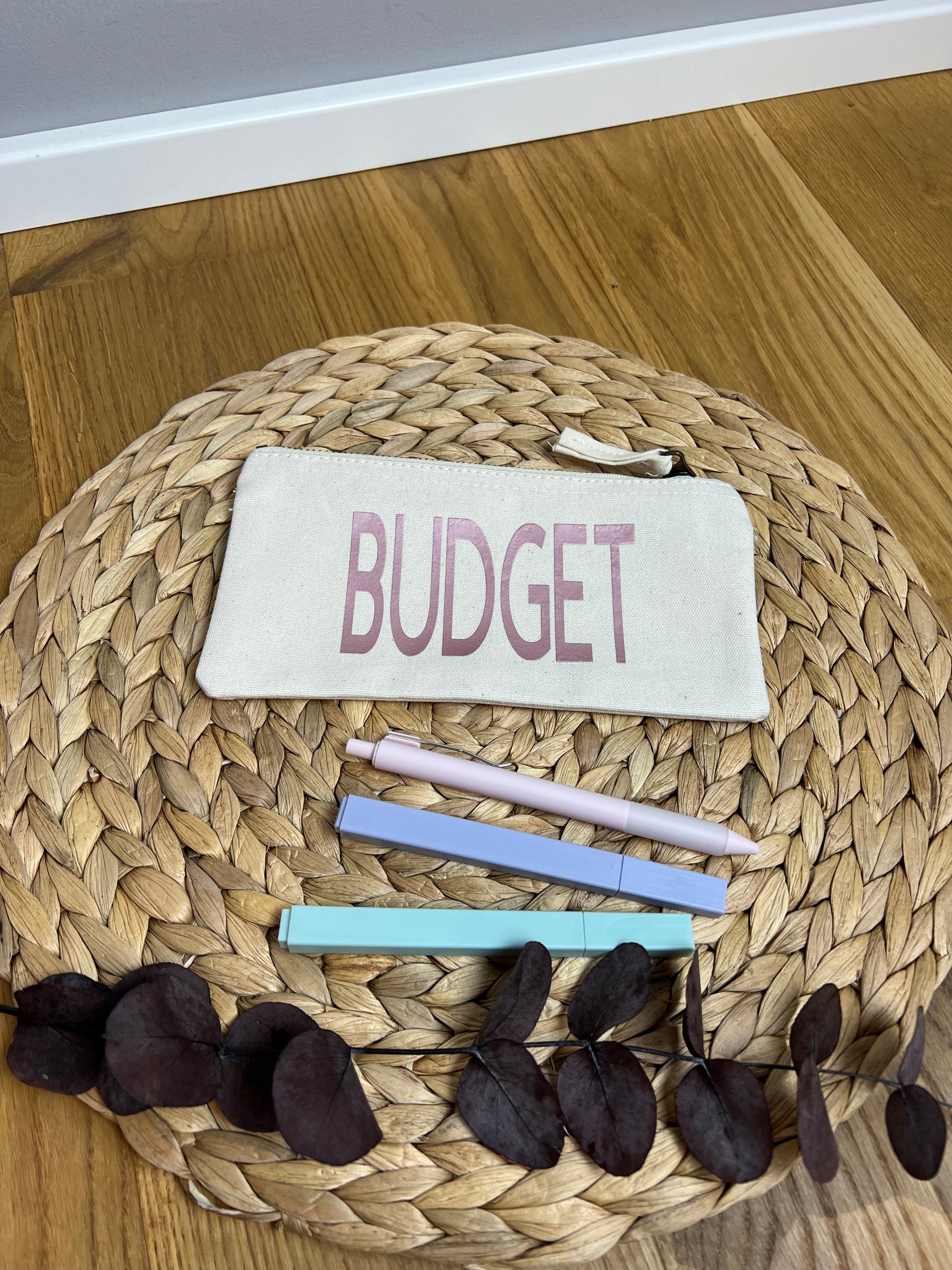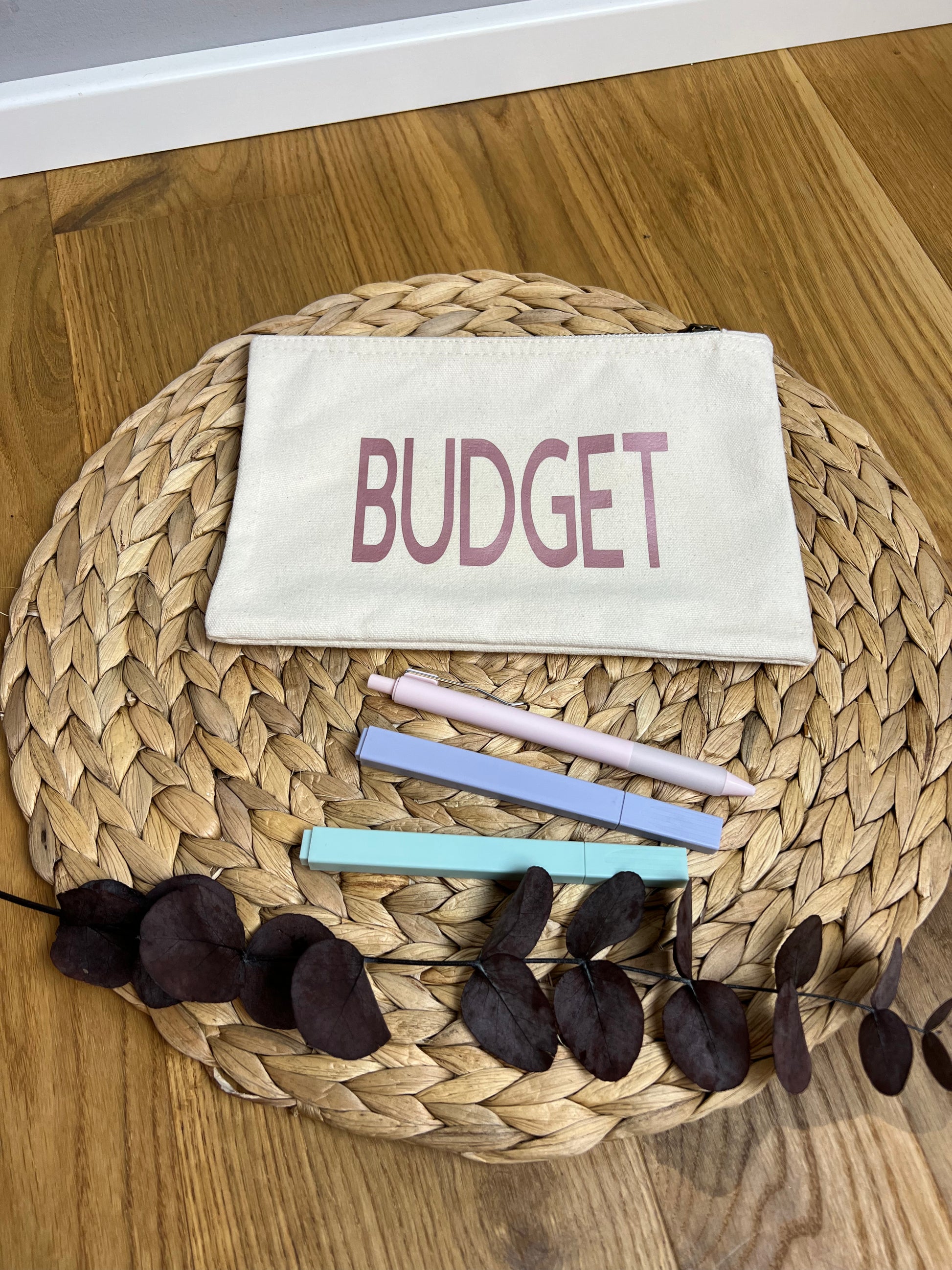 Reißverschluss-Mäppchen mit der Aufschrift „Budget“ in roségold.