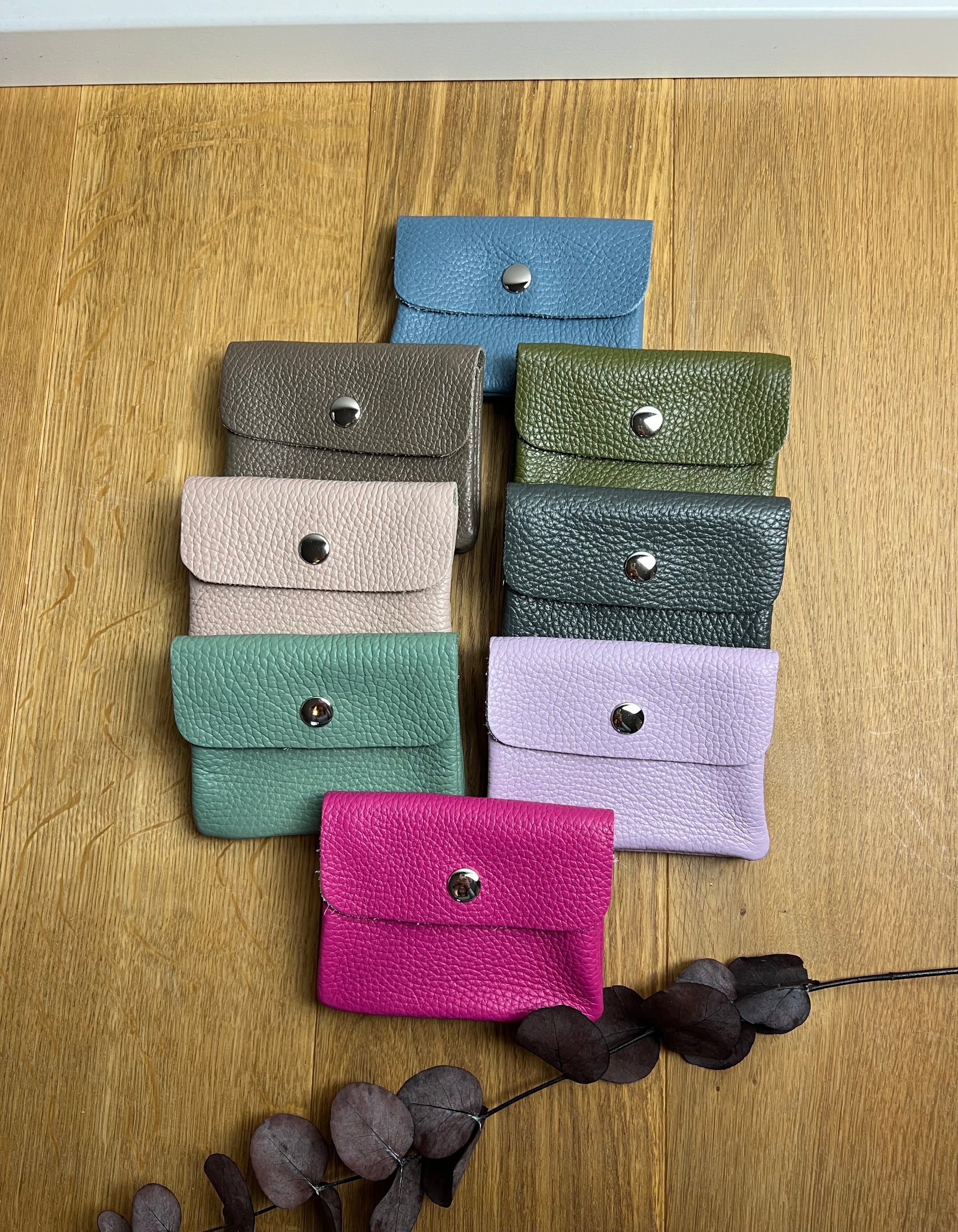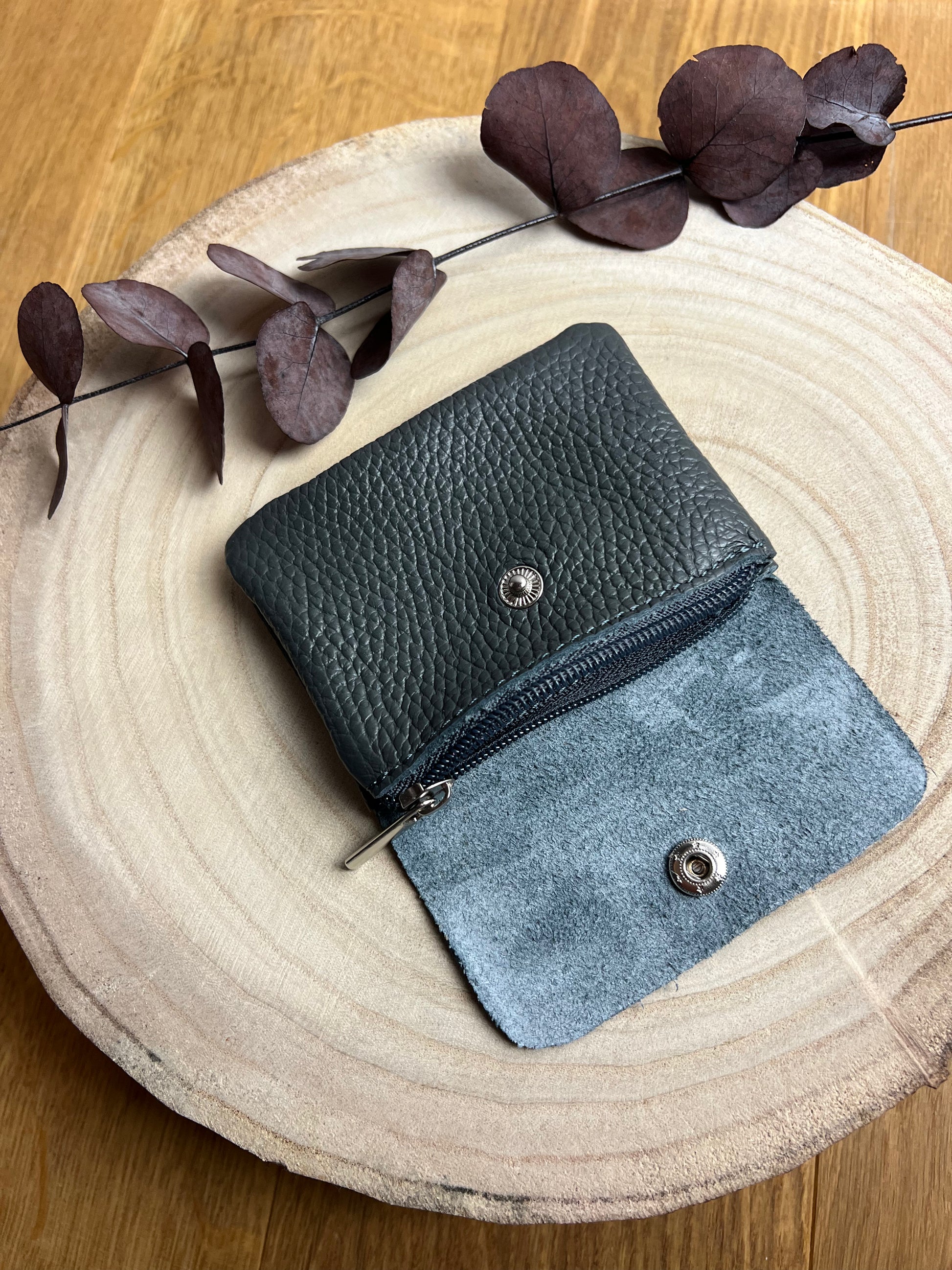 Süße kleine Leder-Geldbörse mit Druckknopf. Innen ist sie mit einem Kleingeldfach ausgestattet, das mit einem Reißverschluss verschlossen ist, sowie zwei weiteren Fächern.