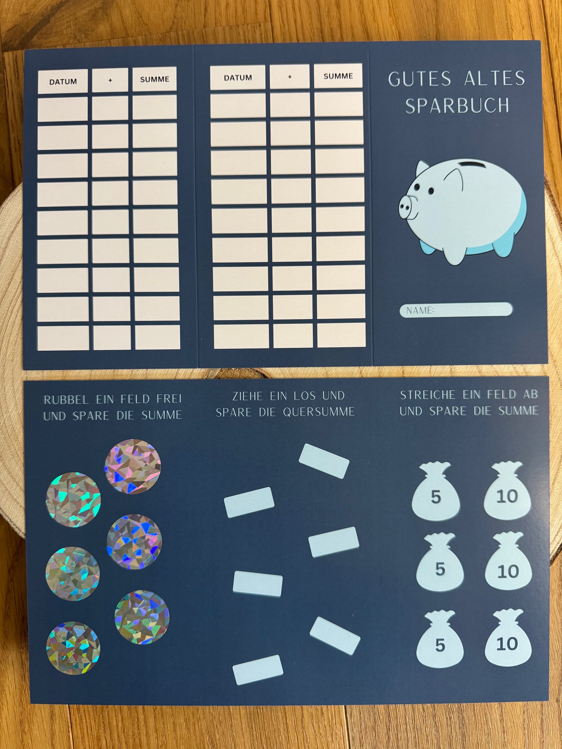 Sparchallenge „Gutes altes Sparbuch“ | 3er Klappkarte | Rubbeln, Lose & Abstreichen