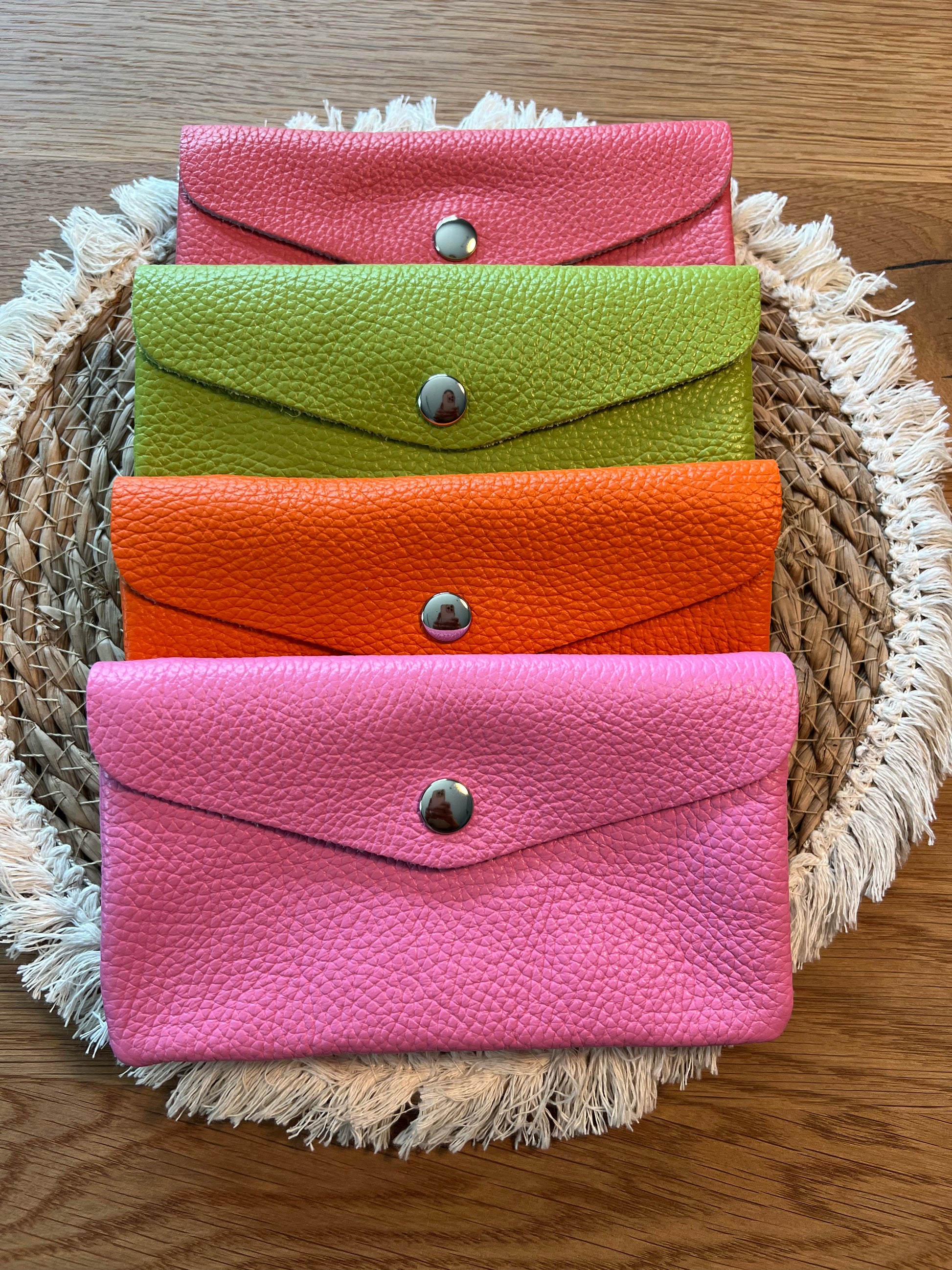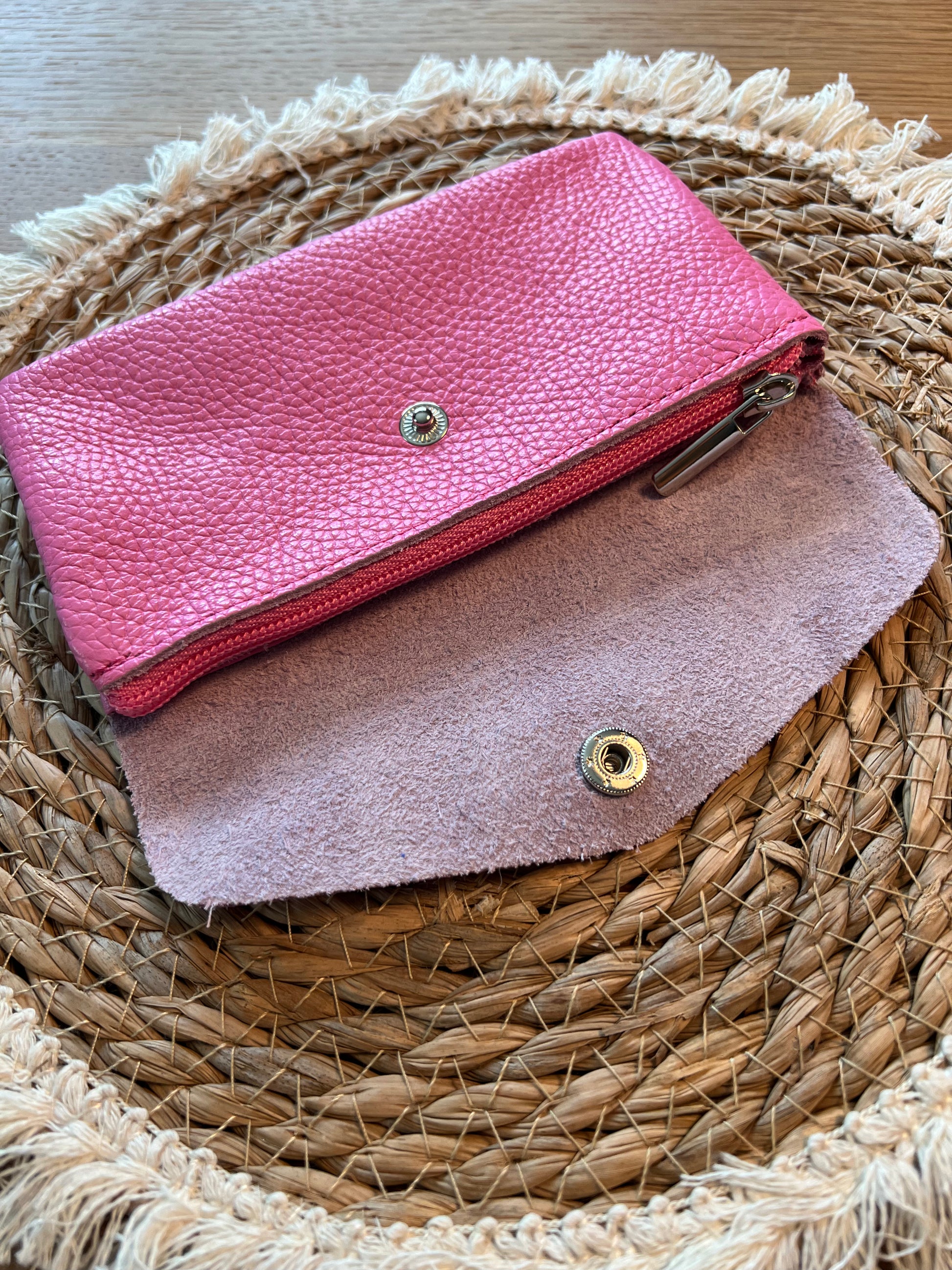 Schöne Leder-Geldbörse mit Druckknopf. Innen ist sie mit einem Kleingeldfach ausgestattet, das mit einem Reißverschluss verschlossen ist, sowie zwei weiteren Fächern.